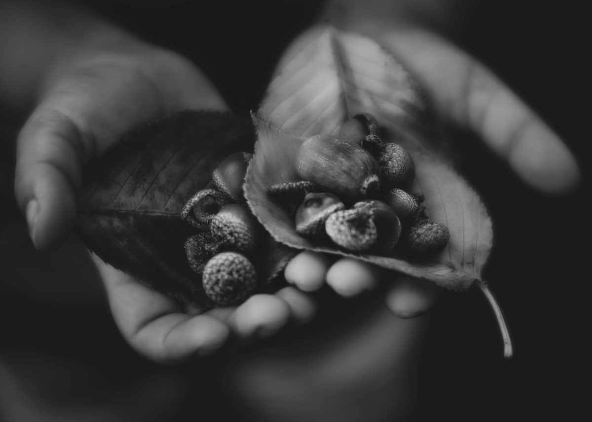 You’ll notice I converted this to black and white so that just his tiny hands and nature collection were emphasized. Next, I burned the space around his hands and brought out the light and highlights on the leaves and acorns. After that you only see what I wanted you to see.