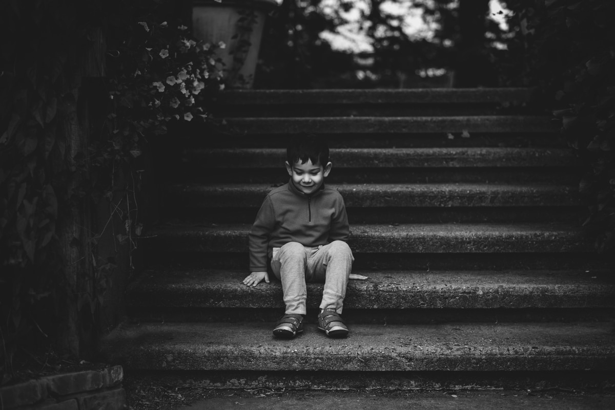 The straight lines of the stairs lead me to my son as he sits amongst them. For instance, when I edited this image, I converted it to black and white so that all you see is the shadow and light play on the stairs as my son sits offset in the middle. Next, I burned the foliage so that your eye was not distracted by it but left slight highlights to give a sense of environment.